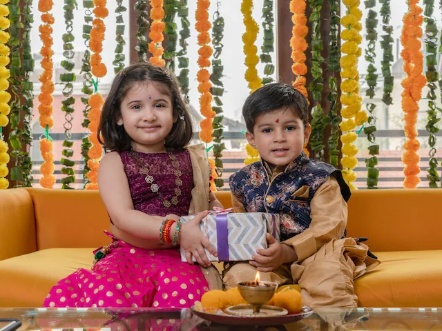 Following the tilak and prayers, the sister offers her brother sweets and dry fruits. The brother, in return, offers a gift to his sister and pledges his lifelong support and protection. The gesture of the gift is a token of gratitude for her love and blessings.