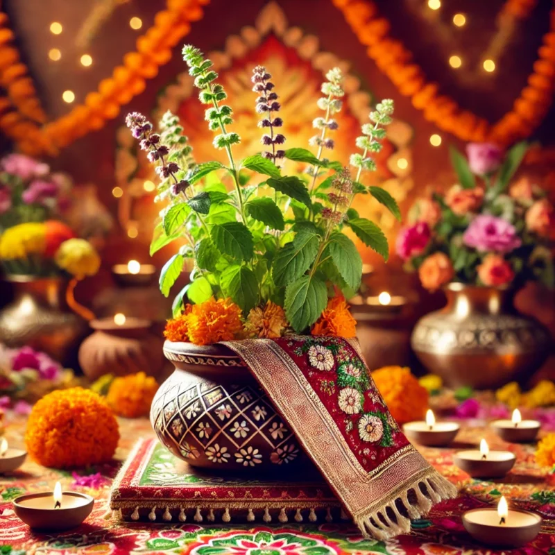 • Adorning the Tulsi Bride: The Tulsi pot is beautifully cleaned, and the plant is adorned with a red sari or chunari, bangles, a nose ring (nath), and bindi.