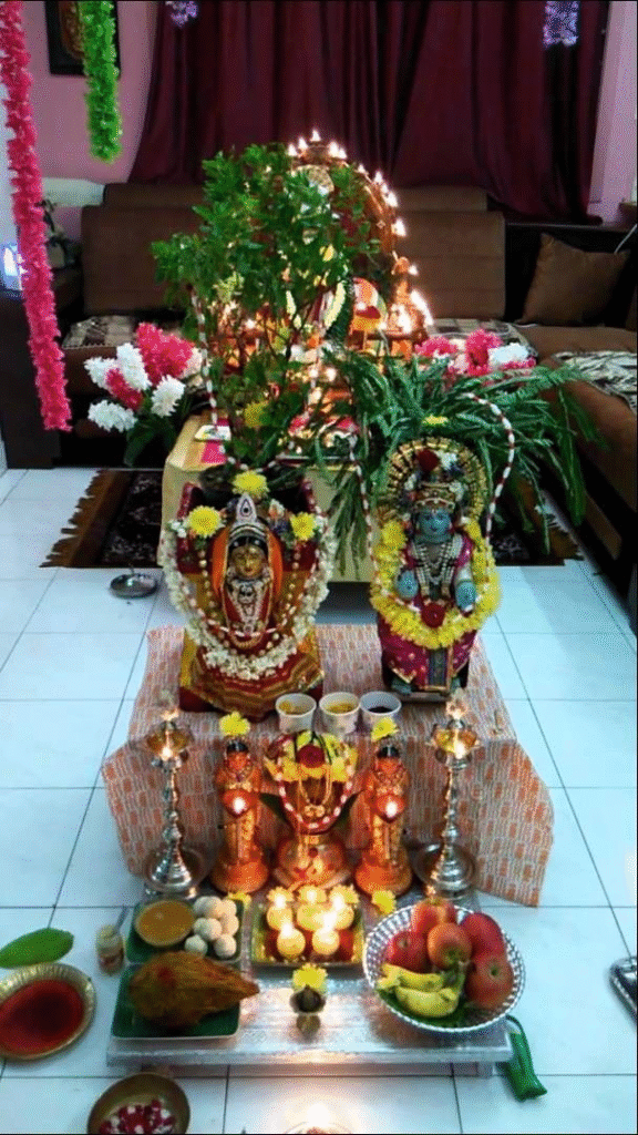 • The Mandap: The Tulsi plant is placed in a clean area, often the courtyard or balcony. A small wedding canopy (mandap) is created around it, decorated with sugarcane stalks, marigold flowers, banana leaves, and bright fabrics.