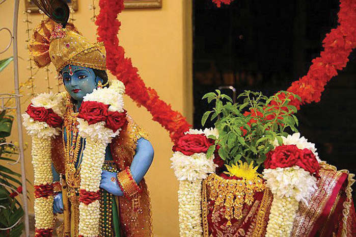 • Dressing the Shaligram Groom: The Shaligram stone or a small idol of Lord Vishnu/Krishna is bathed, dressed in a dhoti, and placed next to the Tulsi.